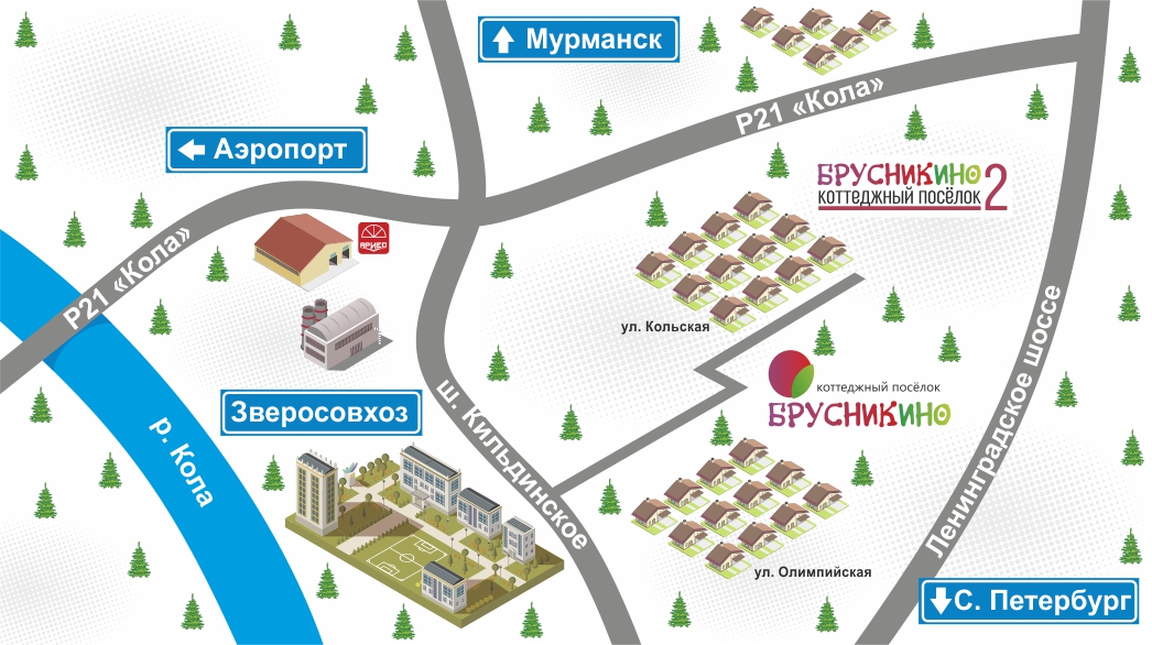 Коттеджный поселок "Брусникино4". Удачное расположение поселка подарит своим жителям природную красоту в сочетании с комфортабельностью современного населенного пункта и возможностью пользоваться инфраструктурой п. Зверосовхоз, а благодаря восточной объездной дороге (Ленинградке) с легкостью можно попасть в любую точку города Мурманска за минимальное время. 25 минут занимает дорога от поселка до дальней точки Мурманска – Ленинского района.